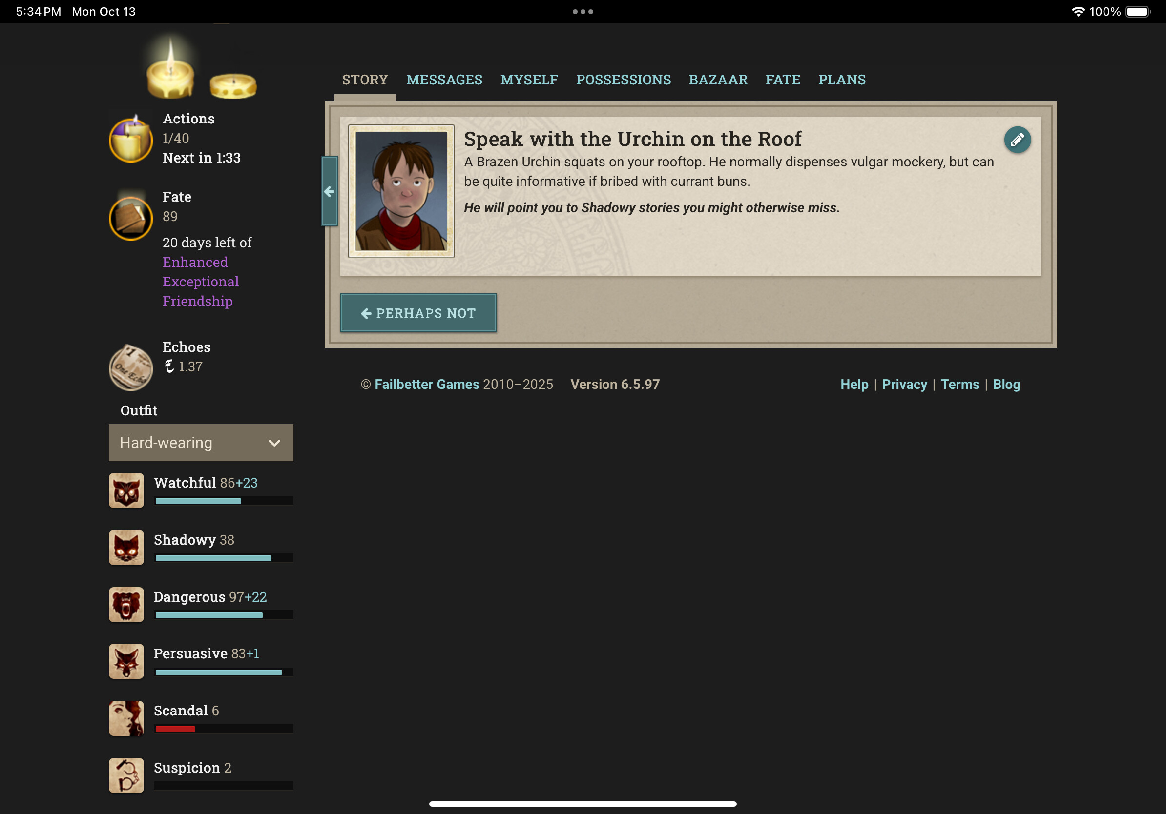 Unfortunately, the option to speak with the urchin on the roof doesn’t pan out either. As for getting that devil card to come up, it hasn’t in days. I don’t know what I did to piss off the Great God Murphy, but that dude has it in for me. ![]()