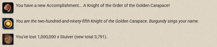 Three-hundred-and-seventy-sixth Knight of the Golden Carapace reporting in for duty. Whew. Now on to another grind, like maybe a few Stuivers to make a Moth. ![]()