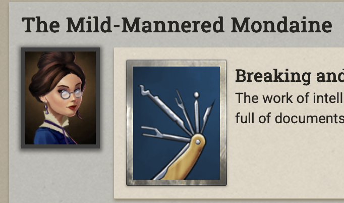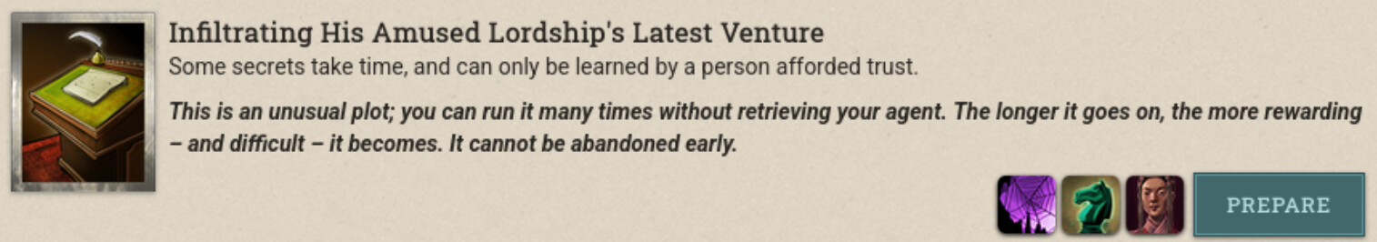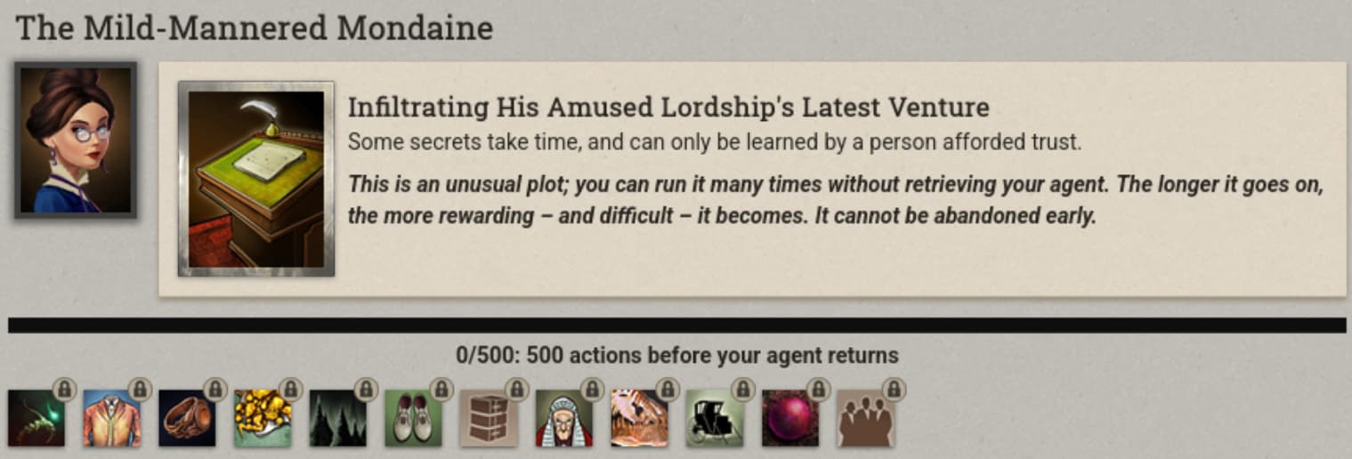 At any rate, do we know if leaving the Mondaine in the infiltration scheme increases the Tremors on the Web quality? Seems mindboggling that (judging by the wiki) there’s apparently people who were already able to increase it to 5 AND run another 500-action plot afterwards. I don’t even want to calculate how much money/resources that must have cost…