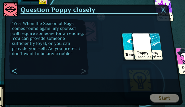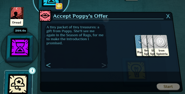 Speaking to her again, this time agreeing to her offer, gives one of each Spintria, which would help beginning Bright Young Things immensely while they’re waiting on gaining Reason to work for Glover & Glover. It also spawns the purple hourglass tile shown left, which just says "In the ‘Season of Rags,’ Poppy will return…"