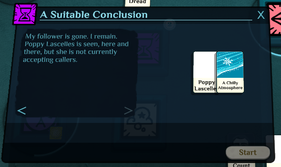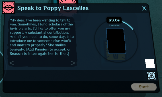 On Poppy Lascelles, I looked through the files to see if there’s a workaround for her being unusable and discovered there’s actually two versions of her in the files: poppy and poppyready. Apparently the patrons operate the same way–the "ready" ones you can speak to to get a commission, and the ones without "ready" you can’t; or in Poppy’s case, she acts like a regular acquaintance. Of course, when you’re introduced to Poppy, you’re given the wrong one. Spoilers for a bit of Poppy’s story (though I’m sure there will be more in later builds), in case any of you would rather wait for her to be properly fixed: (otherwise if you’d rather play it for yourself before it’s officially fixed, press the ~ key, type in poppyready, and press the +1 button)