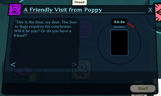 Once the timer hits 0, one of two things may happen: "Silence from Poppy," which just says "Poppy is seen around town, assisting at charitable events, smiling benignly." and restarts the 5 minute timer after 10 seconds. Or, "A friendly visit from Poppy…"