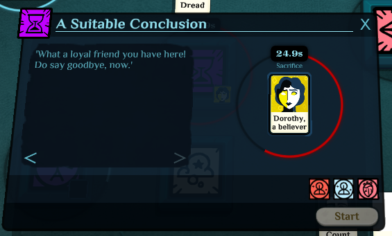 Speaking to her afterwards is the same as talking to a regular acquaintance. Alternatively, if you don’t have any followers to offer… unfortunately, you are taken as a sacrifice to the Sun-in-Rags instead.