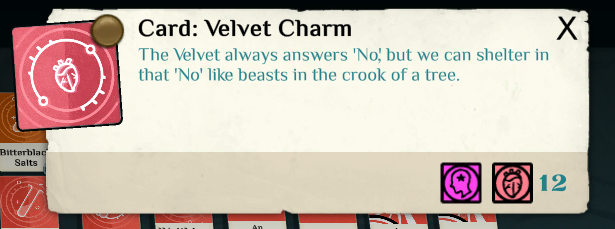 The Velvet being paired with the Heart suggests that it’s hording in the Wood is not done to help the Moth, but maybe lead people away from the Moth’s stripping away of everything through the opposite approach: accumulation of identities, forms, flesh. Such would obviously help maintain the skin of the world, which is what the principle of the Heart is all about. Whenever your character is clearly losing it, they take shelter in memories of happier times and their diaries, which reestablishes a sense of self.