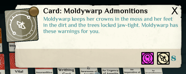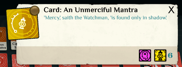 I have to say that I’m looking forward to the Mansus exploration expansion with baited breath. The Catherine Unger art of different rooms and the unique interface complete with map have me hoping Alexis and co. have something more immersive than cards in store for us, something along the lines of HoMD. I’ve been loving the game so far, but it’s my nightmare that exploring the Mansus for ritual ingredients will boil down to clicking on a part of the map, then getting sent back to the regular card table and getting a card that says "Tonight I dreamed of the domain of Hour insert name here, insert sentence detailing surroundings here. While I was there I tripped over a rock and found insert ingredient name here. Then I woke up." I know Alexis won’t let us down!