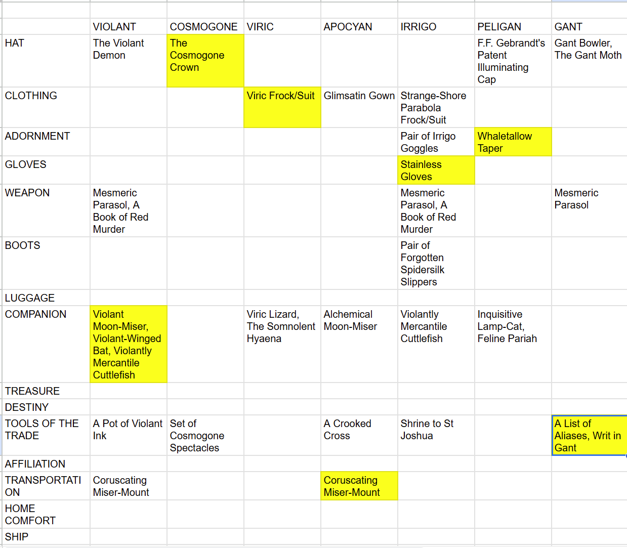 Tools of the Trade (by definition restricted to one Profession): A List of Aliases, Writ in Gant; A Pot of Violant Ink; Set of Cosmogone Spectacles; ETA: A Crooked Cross (apocyan), A Notched Bone Harpoon (peligin, or at least turns your eyes peligin), Shrine to Saint Joshua (irrigo)