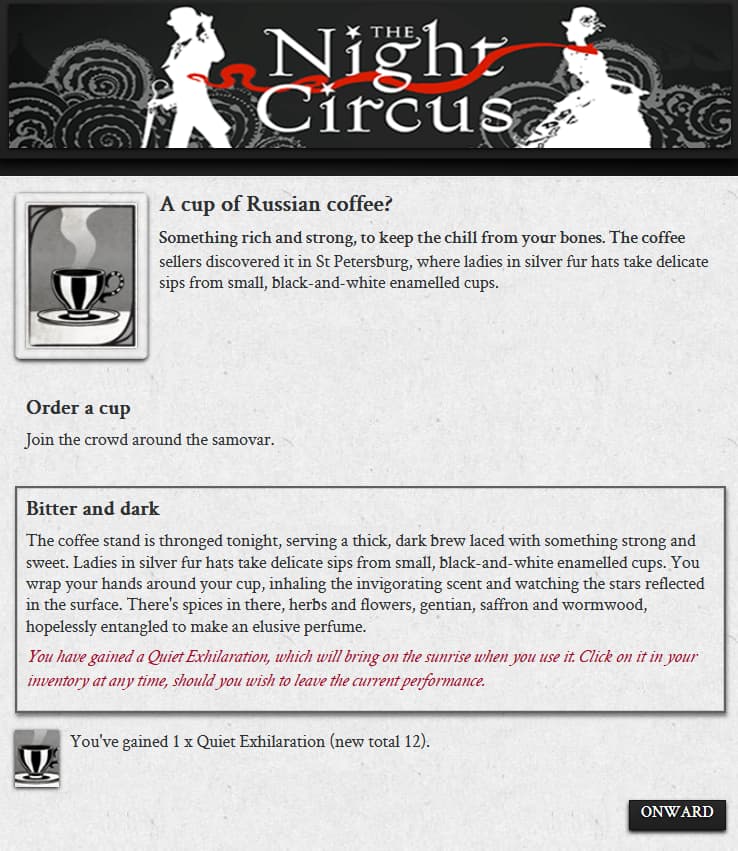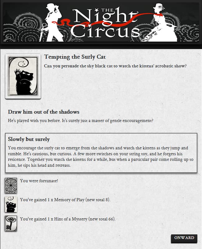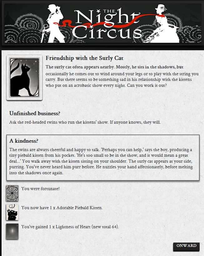 “Random House Group commissioned this award-winning game from Failbetter to celebrate and extend the novel. With Random House’s permission, we have kept the game alive here on StoryNexus so players can continue to enjoy it. The Night Circus is 100% free to play. All content remains the property of Random House, based on the characters and stories of Erin Morgenstern.”