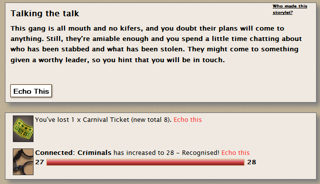 -- Looking for second chances to maximize your loot output from those troublesome storylets? Check out our handy gang of volunteers in this thread, or even volunteer yourself!