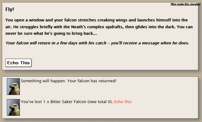 I did so and got the result below. This is definitely not the normal text (the one below 'Echo This') when sending the falcon out to hunt. I hope this bug doesn't mean we lost our falcons. edited by Corran on 1/9/2013