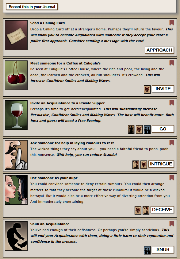 Exactly. Or visiting an area you don't normally have access to, or a branch on a storylet that's only available from another storylet and costs something extra to reach, or a storylet that you don't currently have the qualities to access, and so on. There are possible solutions to all these issues, but it requires considerable thought and work.