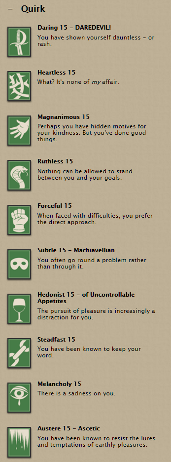 Another way in which raising Quirks is likely to be easier for a newer character (or one willing to nuke connections) is that as I understand it, raising Renown raises a quirk and can go over 10. (It has a corresponding dropping quirk, usually, but let's assume we're finding a way to game the system.) I was already hit hard when I wanted to raise Steadfast and realized that my Renown: Criminals had started so high from the conversion that I wasn't sure I would have enough goes at the Skeleton Key before I could no longer succeed at the check!