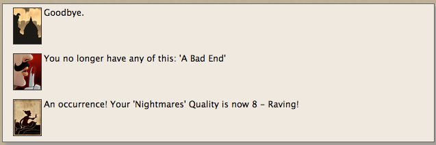 -- "Of two choices, I always take the third." Will do all socials except Loitering or Private Evenings (all my Free Evenings are accounted for), and Affluent Photographer Betrayals only, please. I am not currently accepting calling cards. http://fallenlondon.storynexus.com/Profile/malthaussen