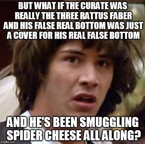 After all, it's not so much that cheese made from sipiders... or by spiders... or via some sort of strange commission for spiders, is in any way an impossibility or even altogether unlikely down here, but that there hasn't been any confirmation by story or dev statement that we are all enjoying delicious, delicious spider cheese with our lovely mushroom wine at our poorly-illuminated subterranean soires.