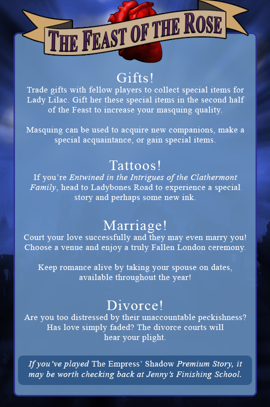 On the 13th February we will be releasing the Lady in Lilac card into your opportunity deck, allowing you to trade in your gifts for Masquing. From the 13th, you’ll also be able to turn in your Masquing for special companions on the Encounters at the Feast card.