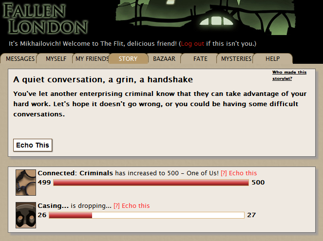 -- Looking for second chances to maximize your loot output from those troublesome storylets? Check out our handy gang of volunteers in this thread, or even volunteer yourself!